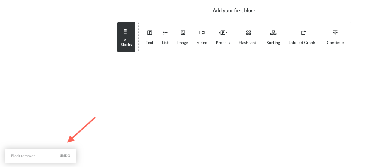 Lorsque vous supprimez un bloc, un message s'affiche dans le coin inférieur gauche du navigateur : Bloc supprimé. ANNULER (ou "Undo" en anglais).