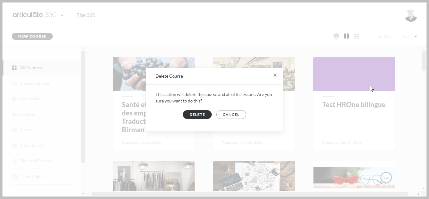 Lorsque vous supprimez un cours, Rise vous demande de confirmer que vous souhaitez le supprimer avant de le supprimer :